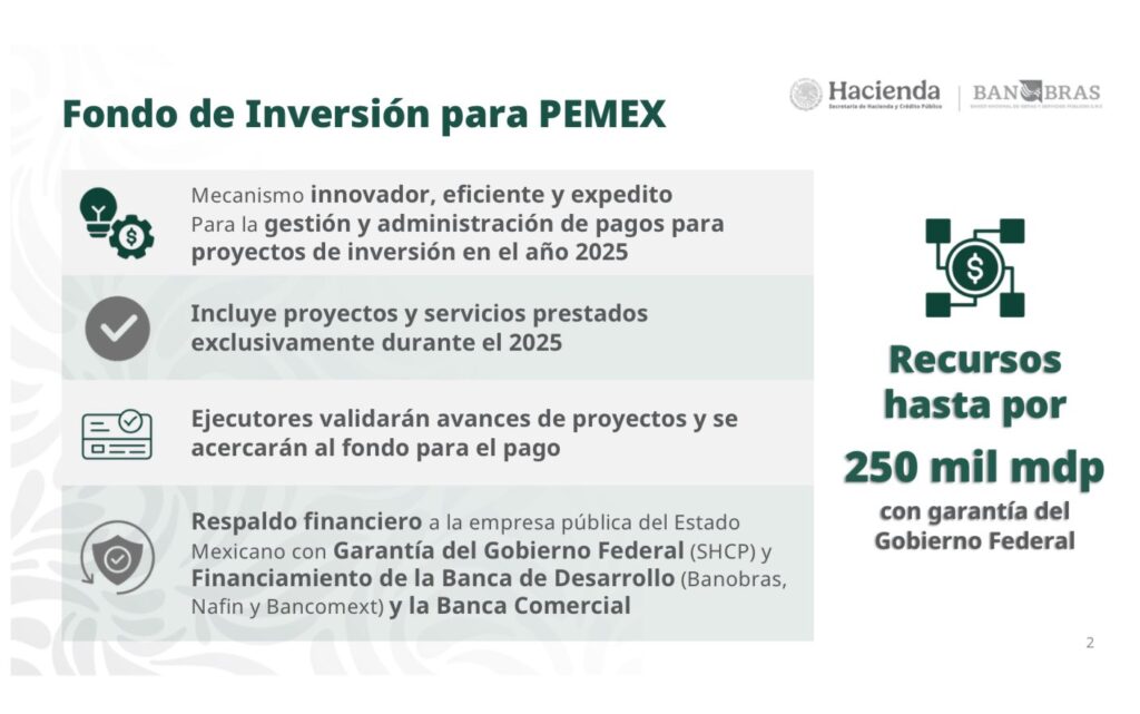 La presidenta Claudia Sheinbaum presentó una estrategia integral de financiamiento para Pemex que incluye la creación de un fondo de inversión de $250 mil millones de pesos, impulsado por Banobras. Este fondo busca apoyar proyectos estratégicos nacionales con respaldo de la banca de desarrollo, comercial y capital privado, y contará con garantía del Gobierno Federal para mantener bajo el costo financiero.